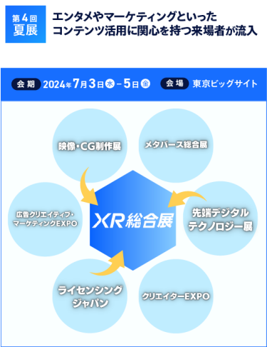 コンテンツ制作、映像CG制作、広告、ブランディング、マーケティング支援、IP、最先端デジタルテクノロジーなどが出展し、メディア、エンターテイメントやブランディング、広報、マーケティング、商品企画に関係するビジネスパーソンが来場する展示会。