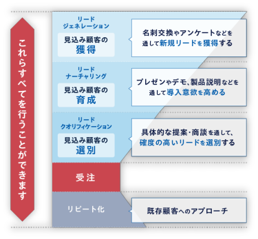 新規リードの獲得から、ナーチャリング、具体的な提案、既存の顧客へのアップセルの提案まで、